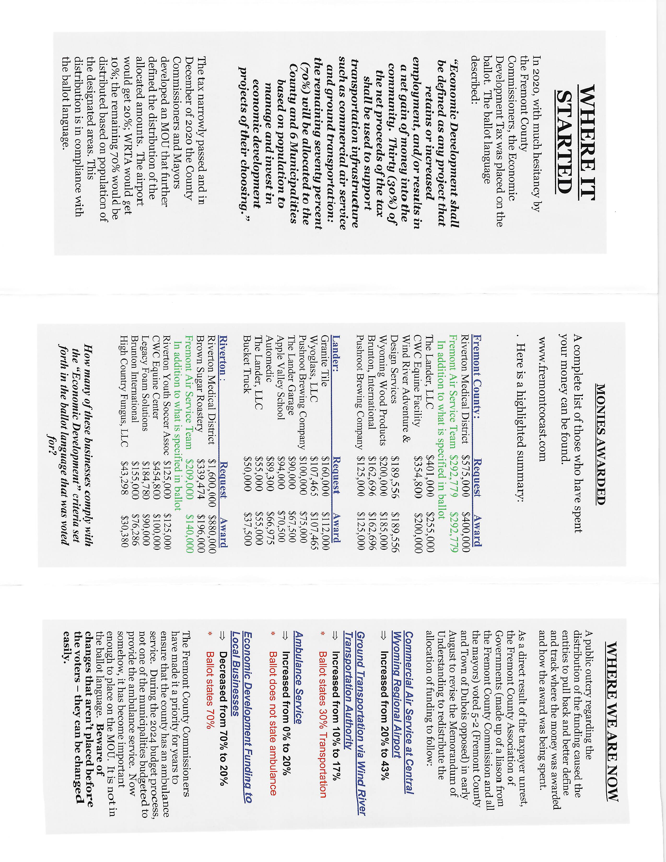 In August 2024, the Fremont County Association of Governments (FCAG) recently amended the Memorandum of Understanding (MOU) regarding the ½-Cent Economic Development Tax. These were made without the consent of the Fremont County Commissioners or the Town of Dubois .
